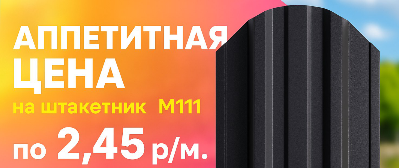 Все лето АППЕТИТНАЯ ЦЕНА на металлоштакетник М111 - 2,45 р/м.п. Данная цена действует на металлический штакетник М111 из стали 0,4 мм с односторонним глянцевым покрытием полиэстер.